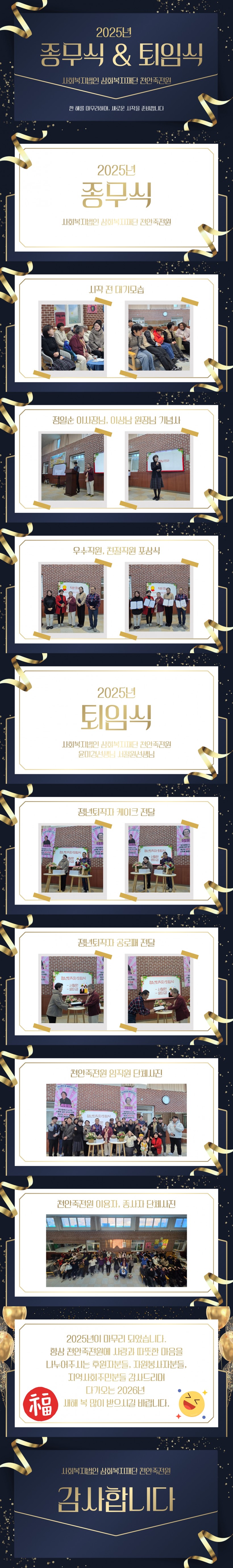 2025년 사회복지법인 삼화복지재단 천안죽전원 종무식 & 퇴임식 페이지 정보 작성자 운영자 작성일25-12-31 13:33 조회80회 댓글0건 관련링크 목록 본문 2025년 사회복지법인 삼화복지재단 천안죽전원 종무식 & 퇴임식을 진행하였습니다.항상 천안죽전원 가족분들의 얼굴에 웃음꽃이 활짝 피실 수 있는 죽전원이 되겠습니다!다가오는 2026년 새해 복 많이 받으세요!감사합니다. 댓글목록 등록된 댓글이 없습니다. 목록