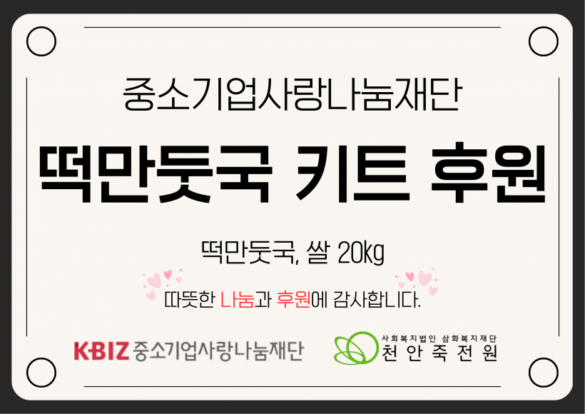 중소기업사랑나눔재단 떡만둣국키트, 쌀 후원 페이지 정보 작성자 운영자 작성일26-02-05 13:45 조회158회 댓글0건 관련링크 목록 본문 26.01.28.(수)중소기업사랑나눔재단 떡만둣국키트, 쌀 후원해주셨습니다.가족분들도 환하게 웃으시면서 맛있게 식사 하셨습니다.천안죽전원에게 사랑과 나눔을 해주신 중소기업사랑나눔재단에게 다시한번 감사의 말씀을 드립니다.감사합니다. 댓글목록 등록된 댓글이 없습니다. 목록