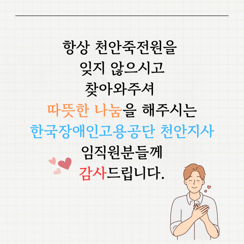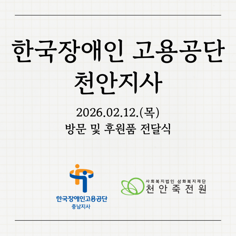 한국장애인고용공단 천안지사 방문 페이지 정보 작성자 운영자 작성일26-02-23 16:00 조회14회 댓글0건 관련링크 목록 본문 26.02.12.(목)한국장애인고용공단 천안지사에서 임직원분들이 방문해주셨습니다.항상 따뜻한 관심과 소중한 나눔을 해주시는 한국장애인고용공단 천안지사 임직원 분들께 감사드립니다. 댓글목록 등록된 댓글이 없습니다. 목록